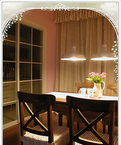 先来看看餐厅,仿古色的餐桌椅,压一下满墙粉色的轻佻。窗帘、桌布、椅垫是一套的,桌布和椅垫是我巧手的婆婆用作窗帘时讨来的布头做的